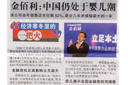 “2008年的销售业绩比我想象中要好,整体销售增长52%,是近几年来增幅最大的一年。”这是金佰利中国有限公司总裁邵青锋在新闻发布会上的开场白。在金融危机第二波狂潮逼近之际,金佰利依然将2009年的销售目标定在增长40%。