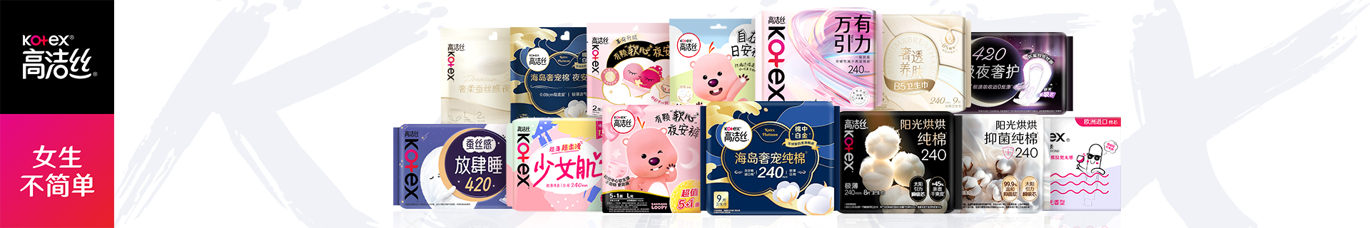 Kotex®高洁丝®品牌 1920年诞生于美国,是全球首个对大众进行经期知识教育的卫生巾品牌,使一次性经期护理用品被广泛接纳。近一个世纪以来,高洁丝帮助全球无数女性享受这款革命性产品所带来的便利。秉持卓越的创新,高洁丝以高品质的产品和贴心的设计,不仅满足女性朋友的生理需求,更令每位女性在生活中倍感呵护和自信。